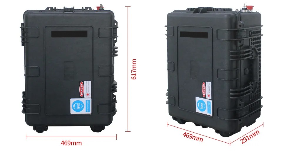Ukupna dimenzija LU pulsnog prijenosnog laserskog čistača od 200/300 W je 617 mm * 469 mm * 291 mm. Težina našeg prijenosnog laserskog čistača je oko 27 kg, a jednostavan je za nošenje i prikladan za vanjska okruženja, kao što su čišćenje zgrada, održavanje cesta, ljepota i popravak automobila itd.